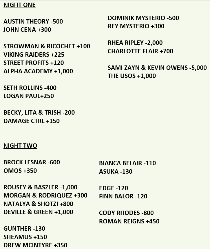 Dominik Mysterio has dropped into -500 from -300. As a result, Rey Mysterio is now up to +300 from +200.
